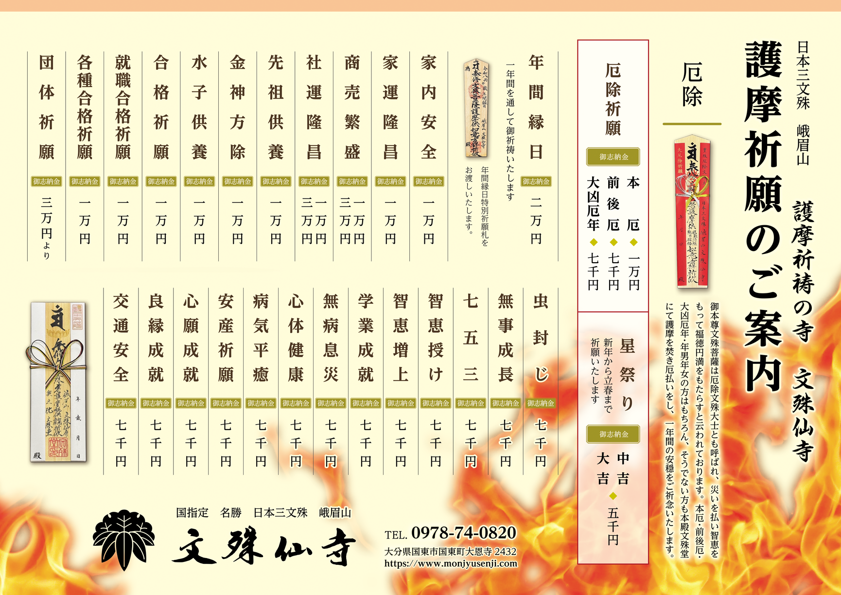 本殿文殊堂にてお申し出下さい。受付の後、護摩祈祷をいたしております。厄除けの方は厄除け星祭表をご参照下さい。 本厄・前後厄・大凶厄年の方は勿論、そうでない方もその年の星をお祭りし、護摩祈祷をお受け下さい。